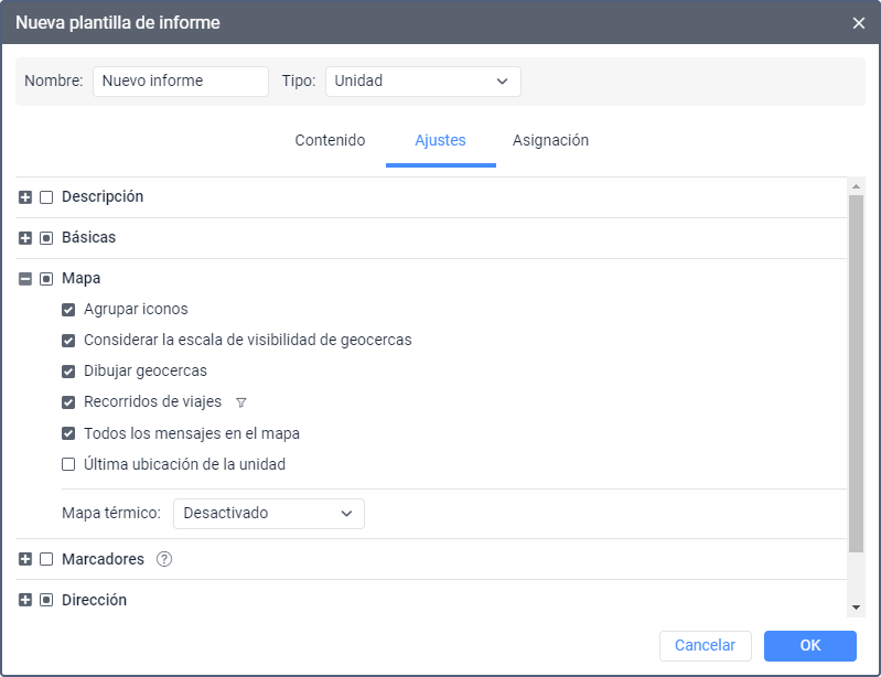 Para que en el mapa se visualicen geocercas al generarse un informe, hace falta escoger en la sección Mapa de la plantilla del informe el punto Dibujar geocercas.