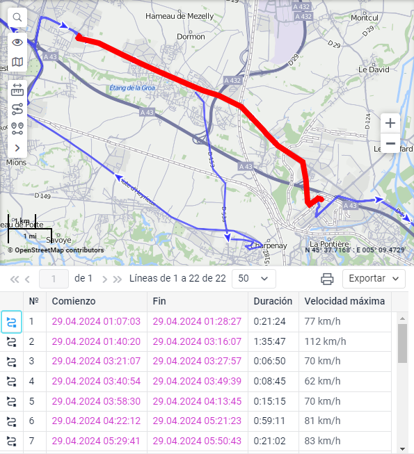 . Al hacer clic en tal icono, el mapa se centra en el segmento correspondiente y este se resalta con una línea roja. Esta función también está disponible para la tabla Viajes del informe por conductor.