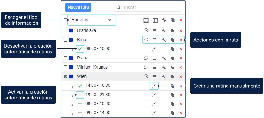 Al gestionar la lista de rutas, puede utilizar los siguientes iconos: