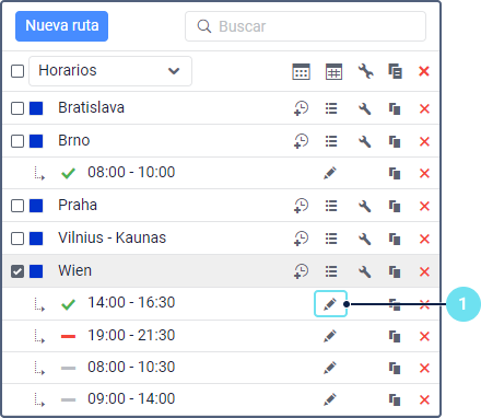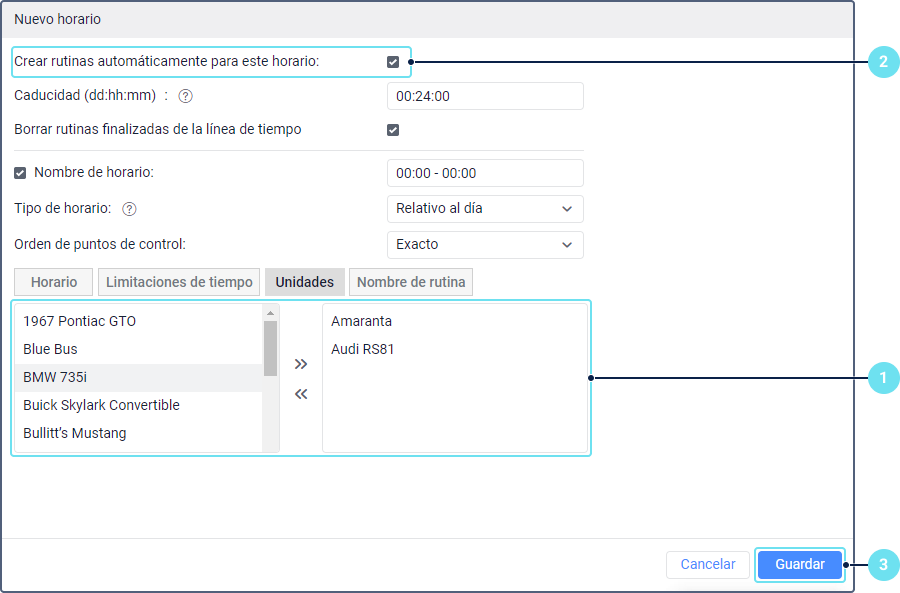 Más tarde puede activar y desactivar la creación automática de rutinas usando el icono / al lado del nombre del horario.Las rutinas se crean automáticamente cuando antes de la hora de llegada planificada al primer punto de control quedan tantos minutos cuantos están indicados en el campo de desviación. Si varias unidades están indicadas, se asigna la que es la primera en abandonar la geocerca del punto inicial de la ruta sin importar el orden de puntos seleccionado. |