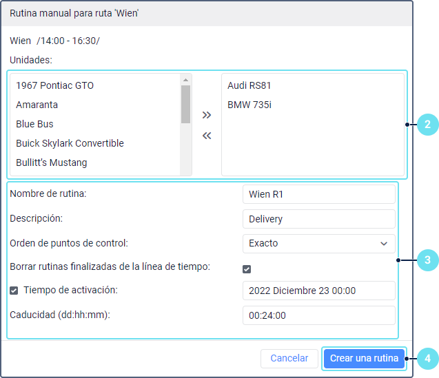 Asimismo, puede eliminar rutinas de la línea de tiempo manualmente en el listado de rutinas.Tiempo de activación Hora y fecha en que el sistema empieza a seguir la rutina. Si no está indicado, el inicio de la rutina se considera la llegada al primer punto (si el orden de puntos es estricto) o a cualquier punto (en los demás casos). Caducidad* Tiempo (días:horas:minutos) al expirar el cual la rutina se finaliza forzadamente y aparece con el estado Anulada. Este tiempo se calcula desde la hora de activación de la rutina. Por defecto, el tiempo de caducidad es de 24 horas. -