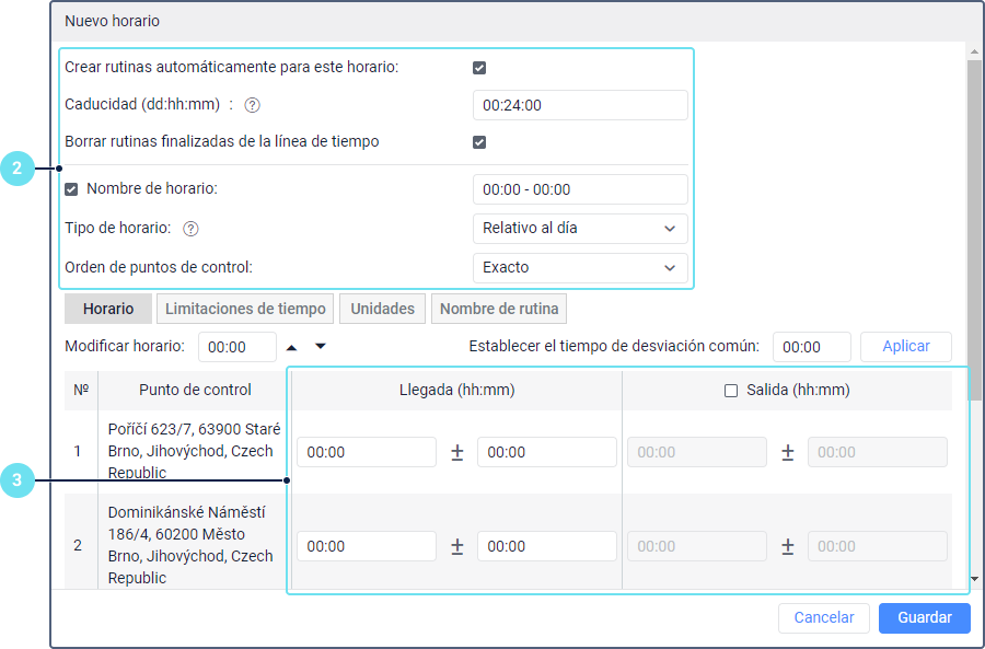 En la pestaña Horario, indique las horas de salida y llegada para puntos de control.