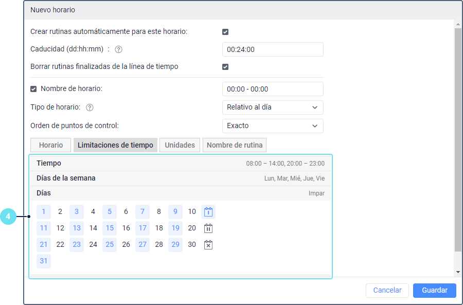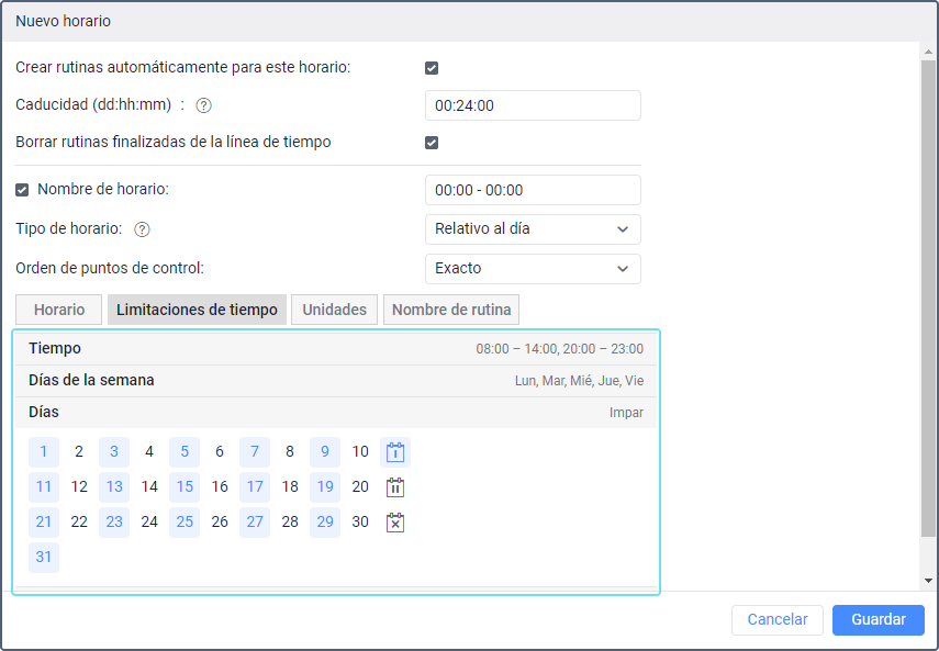 En la pestaña Limitaciones de tiempo, indique horas, días y/o meses cuando se debe aplicar este horario.