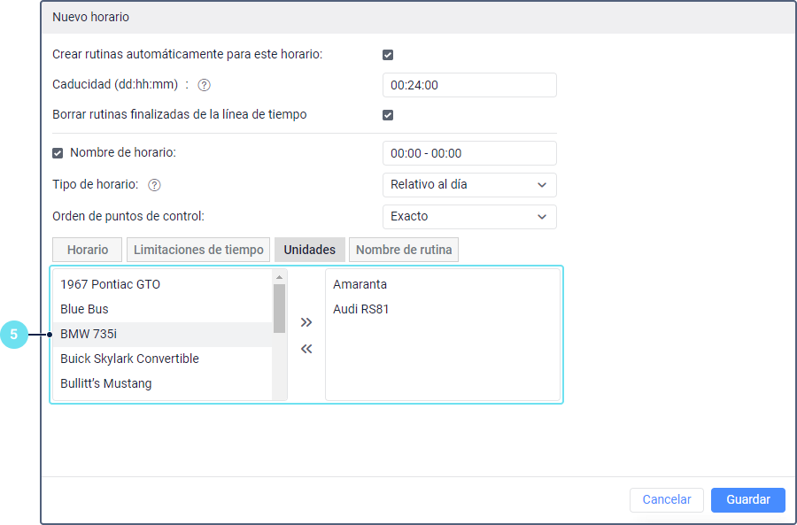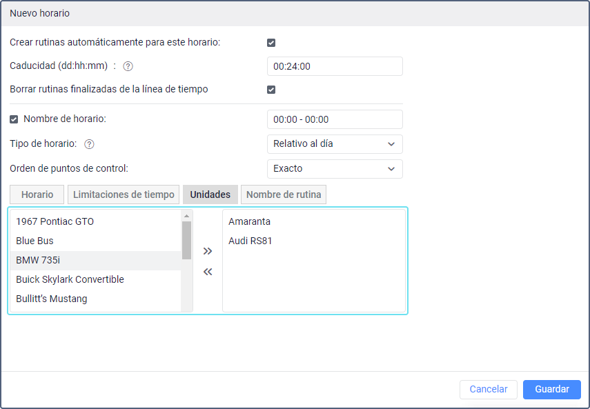 En esta pestaña, puede escoger unidades que se deben asignar a rutinas creadas con base en este horario. Es obligatorio escoger unidades para que las rutinas se creen automáticamente. Si planifica crear rutinas manualmente, puede omitir este paso y asignar una unidad inmediatamente durante la creación de la rutina.