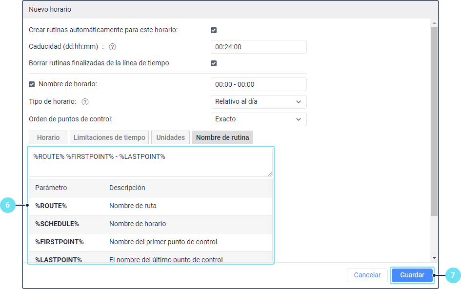 Por defecto, el siguiente formato de nombre se aplica durante la creación automática de rutinas: %ROUTE% %FIRSTPOINT% - %LASTPOINT%.