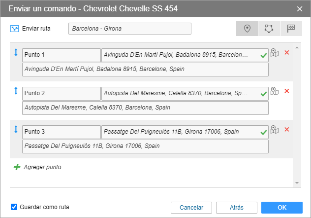 Se puede guardar los puntos indicados como una ruta para utilizarla después en la pestaña Rutas del sistema de seguimiento. Para hacerlo, active la opción Guardar como ruta.