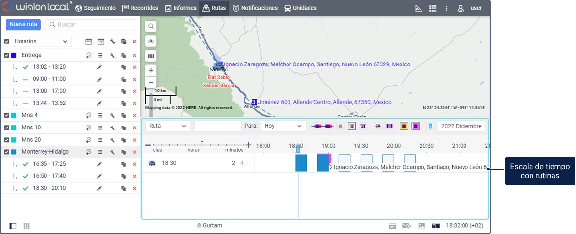 - mediante la línea de tiempo en la pestaña Rutas;
