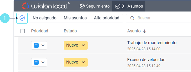 | Horas de motor* | El valor del contador de horas de motor en el momento del trabajo de mantenimiento. Por defecto se muestra el valor actual, pero puede editarlo. Este campo se muestra solo para asuntos del tipo Trabajo de mantenimiento. |
