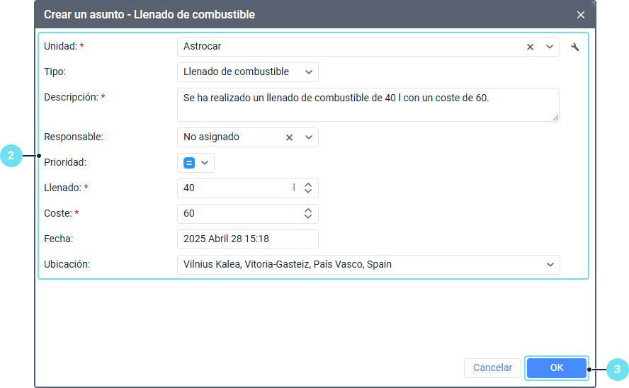 | Llenado* | La cantidad de combustible llenado. Este campo se muestra solo para asuntos del tipo Llenado de combustible. |