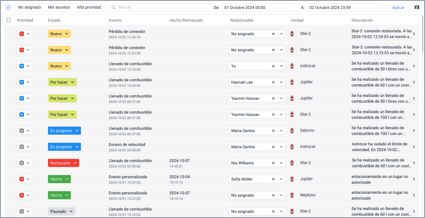 Hecho/Rechazado | Fecha y hora en la que ha cambiado el estado del asunto a Hecho o Rechazado. Si el asunto tiene otro estado, no se muestra nada en esta columna. |