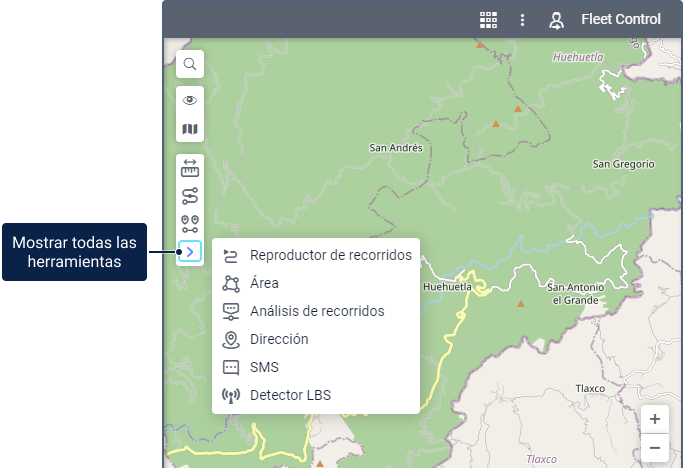 El menú de herramientas se encuentra en la parte izquierda del mapa. Por defecto, se muestran solo los iconos de las tres primeras herramientas. Para ver las demás, haga clic en el icono
