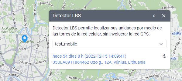 El detector LBS es una herramienta que permite determinar la última ubicación de la unidad por medio de estaciones base de telefonía móvil. Para utilizarla, se requiere el derecho de acceso a unidades Solicitar informes y mensajes a la unidad.