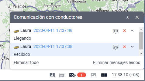Los mensajes enviados por el conductor se muestran en el historial y en la ventana Comunicación con conductores igual que los comandos enviados desde un dispositivo. En esta ventana se puede responder al mensaje del conductor haciendo clic en el icono