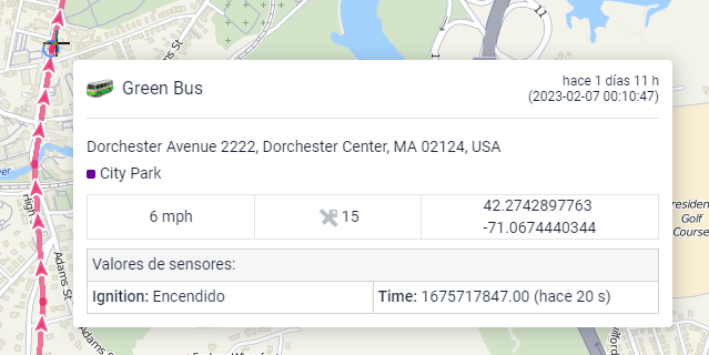 Al colocar el cursor sobre el recorrido, el punto más cercano en un radio de 50 píxels del que se ha recibido un mensaje se resalta con un círculo azul pulsante. La descripción emergente del punto puede contener la siguiente información: