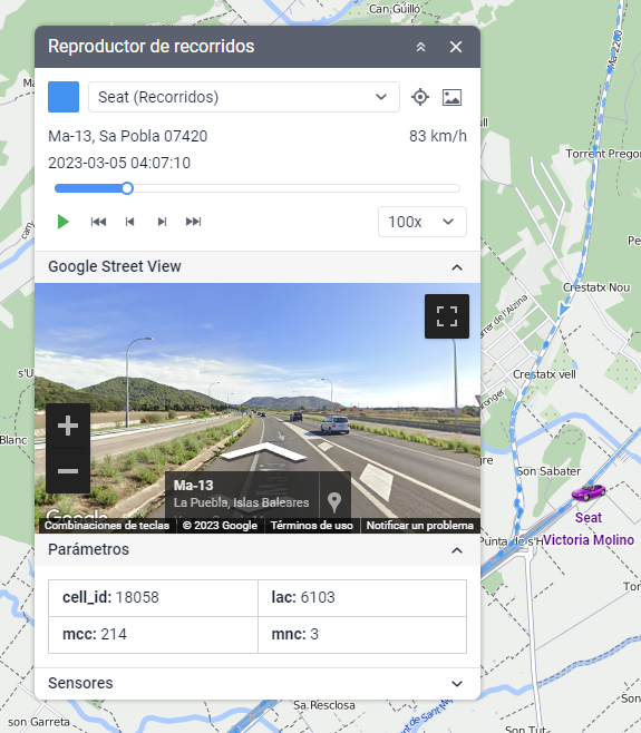 Durante la reproducción, bajo el nombre de la unidad, se muestran la dirección y velocidad de cada mensaje; y encima de la escala temporal, la fecha y hora. Además, si hay claves de Google o Regional, se puede seguir el movimiento de las unidades usando las vistas panorámicas de calles. Para eso hay que desplegar las secciones Google Street View o Regional Panorama situadas abajo.