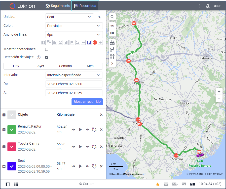 Para ir a la pestaña Recorridos, haga clic en su nombre en la barra superior o marque el elemento del mismo nombre en los ajustes del menú principal. En esta pestaña, puede ver los recorridos y gestionarlos. En los recorridos se pueden mostrar los marcadores que indican los lugares de paradas, estacionamiento, relleno o descarga de combustible, etc.