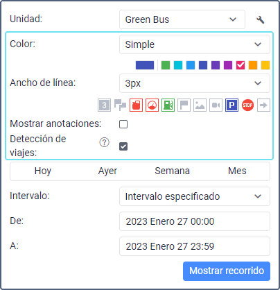 Los parámetros de recorridos son: color, ancho de línea, marcadores, opciones Mostrar anotaciones y Detección de viajes. Los parámetros del recorrido se configuran antes de visualizarlo. Cuando el recorrido ya está visualizado, no se puede modificar sus parámetros.