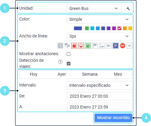 - Indique el intervalo de tiempo al que debe corresponder el recorrido. El intervalo se indica de la misma forma que en los informes.