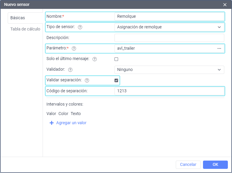 - se reciba el parámetro con el código de separación indicado en las propiedades del sensor de tipo Asignación de remolque;