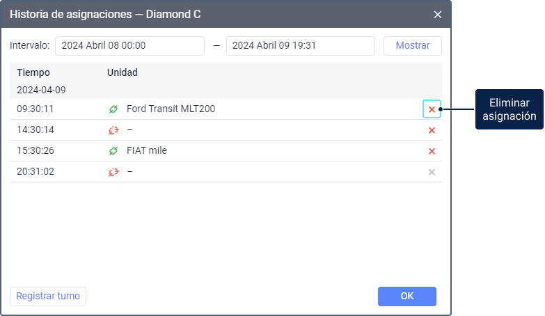 Para ver la historia de asignaciones, indique el intervalo necesario y apriete Mostrar. En la lista de asignaciones se muestra el nombre de la unidad, la fecha y hora de la asignación y separación.