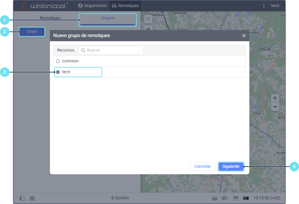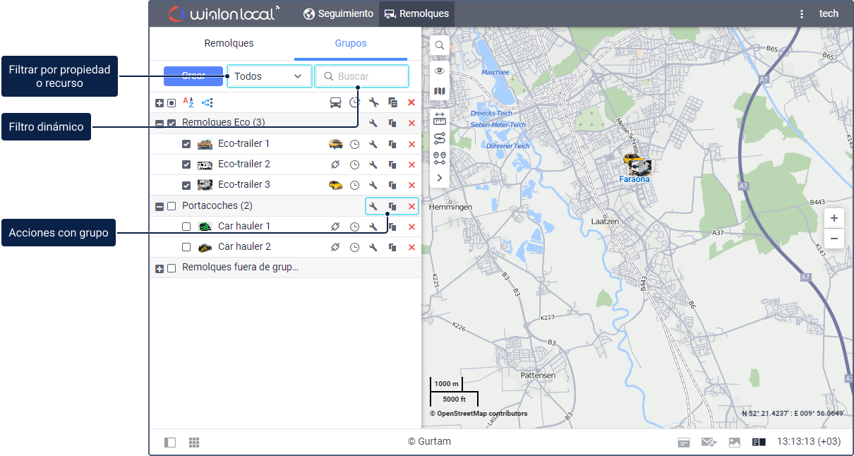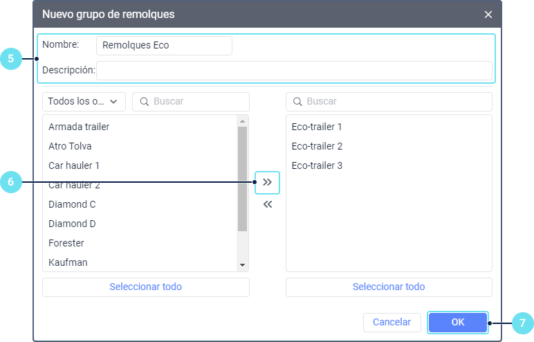 . Para facilitar la búsqueda del grupo necesario, emplee el filtro dinámico o filtro por propiedad (remolques asignados o no asignados) o por recurso.