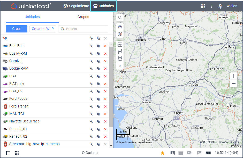 En la pestaña Unidades, puede crear unidades y grupos de unidades que luego se observan en la pestaña Seguimiento. Asimismo, aquí puede realizar las siguientes acciones con unidades: enviar SMS, modificar propiedades, copiar y eliminar. En la pestaña hay búsqueda dinámica por nombre de unidad.