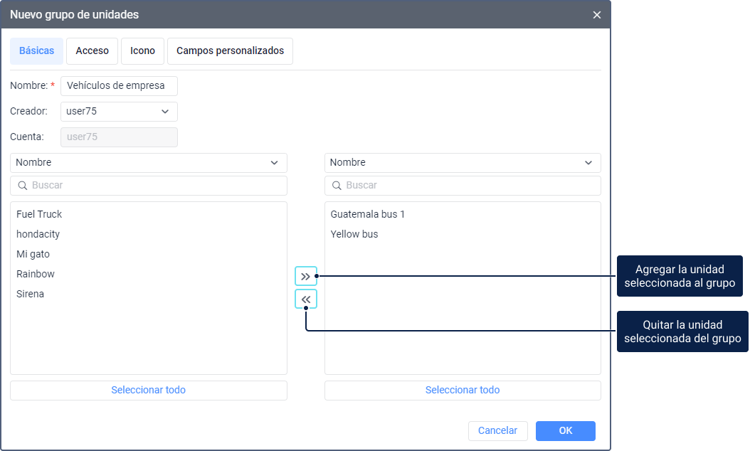 | Unidades | En la lista izquierda se muestran todas las unidades disponibles, en la lista derecha, las que ya se han agregado al grupo.Para cambiar el número de unidades agregadas al grupo, a este se requiere el derecho de acceso Modificar objetos recursivos. Para encontrar unidades por nombre rápidamente, utilice el filtro dinámico. Para buscar por otras propiedades de la unidad (por ejemplo, ID único, tipo de dispositivo, etc.), escoja la opción correspondiente en la lista desplegable encima de la búsqueda. Para agregar una unidad al grupo, muévala de la lista izquierda a la derecha; para quitar, haga lo contrario. Para mover unidades, utilice los iconos / o haga doble clic en las unidades seleccionadas.Para seleccionar varias unidades, mantenga presionada la tecla Ctrl y seleccione las unidades necesarias. Para seleccionar todas las unidades en la lista a la vez, apriete Seleccionar todo. También las unidades se pueden agregar o quitar de los grupos automáticamente. Para hacer esto, cree una notificación con el modo de acción Agregar o quitar unidades de grupos. |