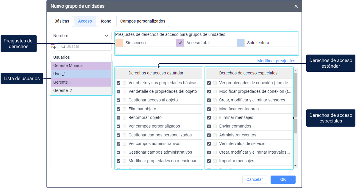 En la pestaña se puede conceder a los usuarios los derechos de acceso al grupo. Los derechos también se aplican a todas las unidades agregadas al grupo.