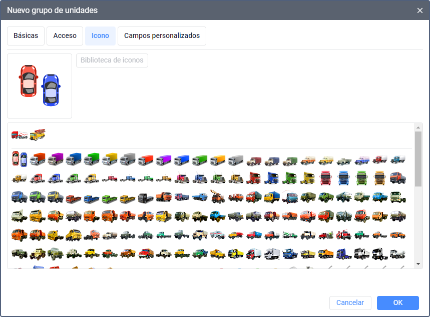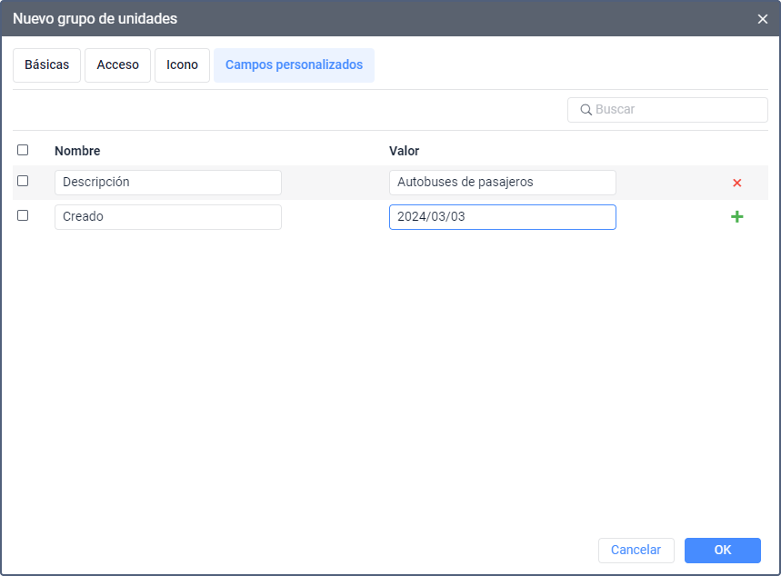 En la pestaña se puede crear campos personalizados con información adicional sobre el grupo o las unidades que se han agregado a la misma.