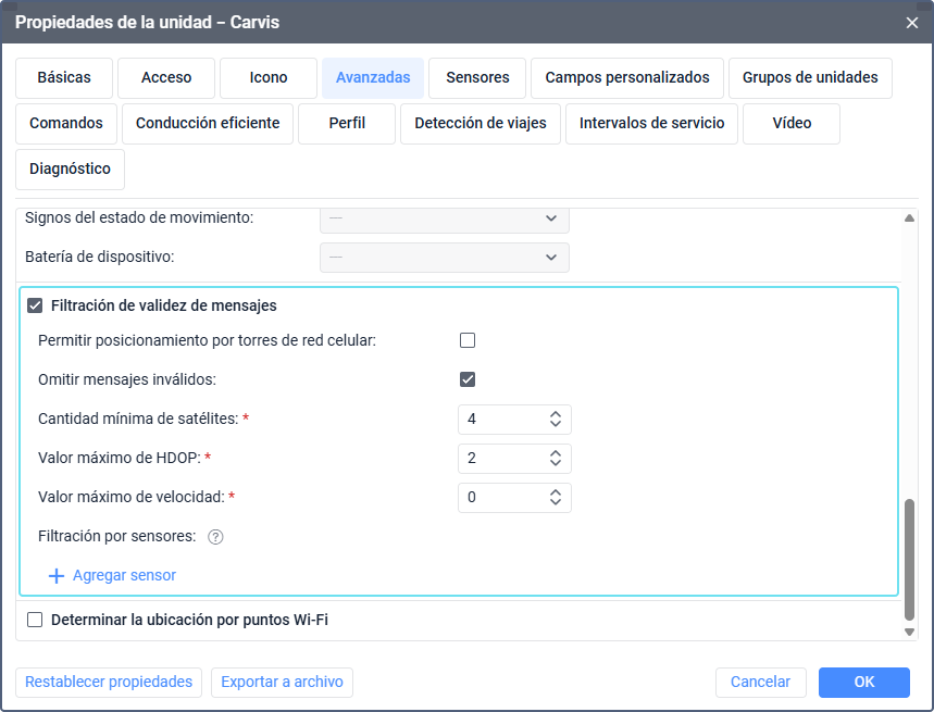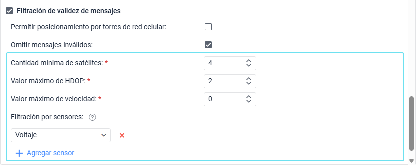 | Filtración de mensajes | Aquí se puede añadir sensores que deben utilizarse para filtrar mensajes. Si el valor del sensor seleccionado es 0, el mensaje se considera inválido. Para añadir un sensor, haga clic en Agregar sensor y seleccione el necesario de la lista. Puede añadir varios sensores. |