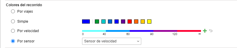 | Por sensor | El recorrido se representa en diferentes colores dependiendo de los valores del sensor escogido. En la lista hay sensores creados para la unidad. Los intervalos y colores para el recorrido se establecen en las propiedades de estos sensores.Si los ajustes de intervalos han sido eliminados de las propiedades del sensor seleccionado, el sistema automáticamente cambia al uso de otro sensor que tenga los intervalos configurados. En caso de no existir otro sensor con los intervalos configurados, se utiliza la opción Por viajes. |