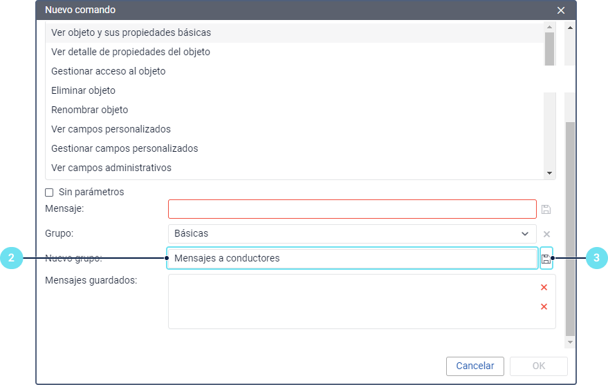 | Canal | El canal (tipo de conexión) que debe usarse para enviar el comando: Automático, TCP, UDP, Virtual, SMS. La lista de canales depende del tipo de dispositivo escogido en la pestaña Básicas. Los canales se describen con más detalle a continuación. |