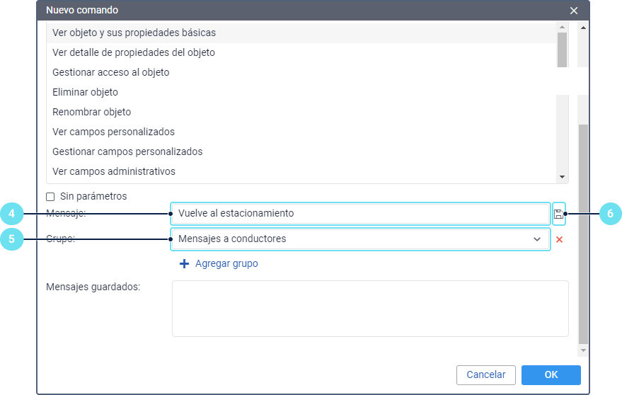 Si la opción Sin parámetros está habilitada, se requiere introducir los parámetros del comando cada vez que lo envíe.