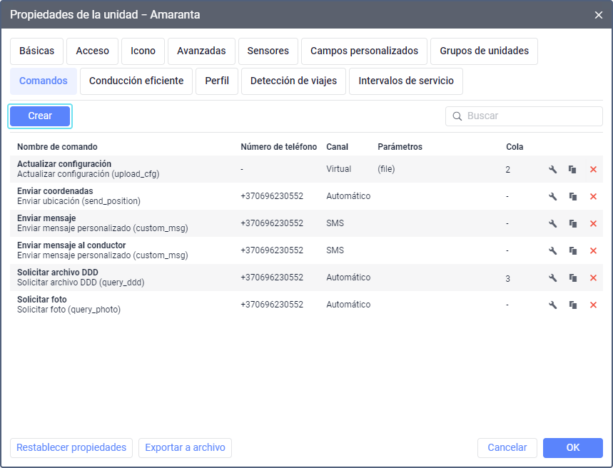 SMS | Por este canal se envían los comandos GSM. Para usarlo, en las propiedades de la unidad debe estar indicado el número de teléfono del dispositivo en el formato internacional y en las propiedades de la cuenta debe estar activado el servicio Mensajes SMS. |