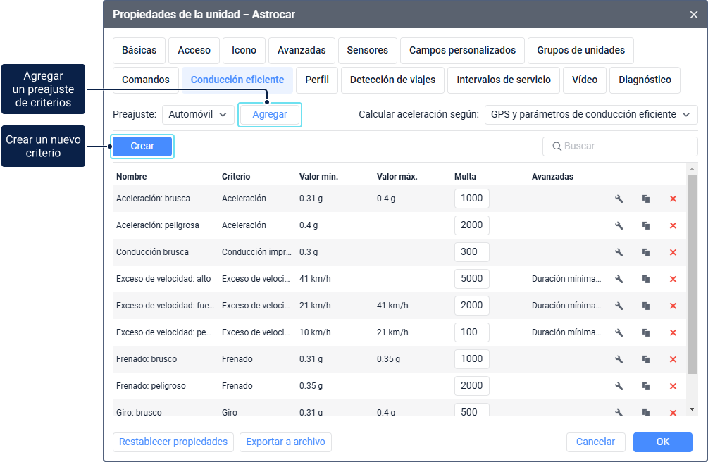 Se puede agregar los criterios de conducción eficiente aplicando un preajuste o crearlos manualmente.