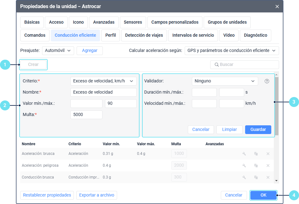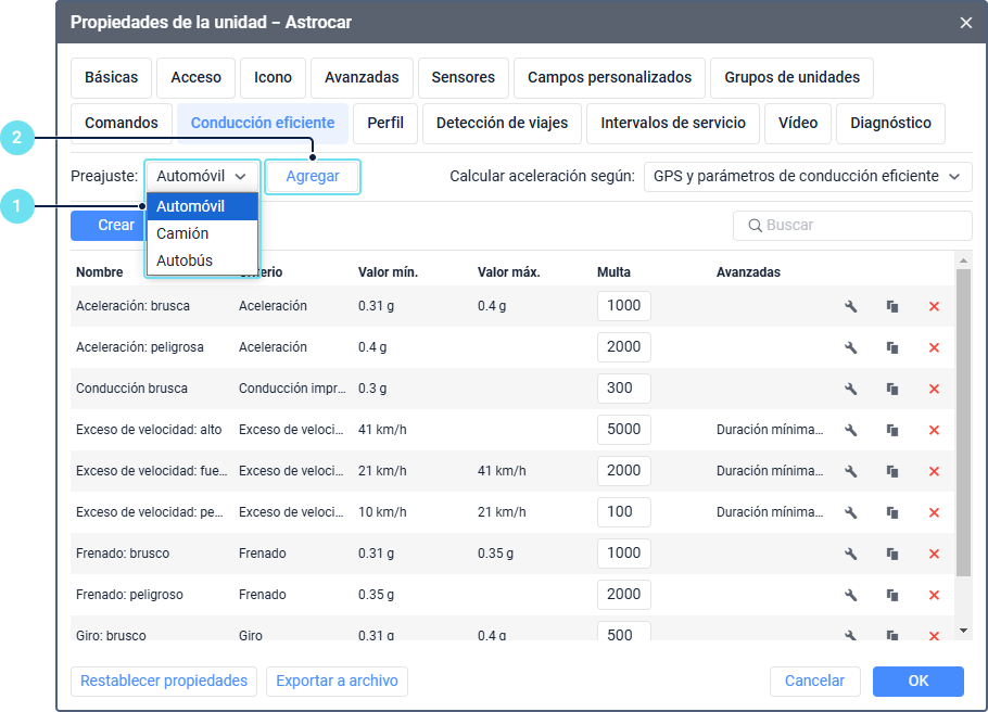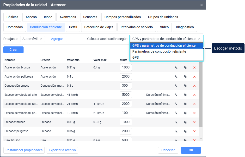 En esta pestaña se puede escoger el método que debe emplearse para calcular aceleración y agregar criterios que permiten evaluar la calidad de conducción y detectar infracciones. Es necesario para mejorar la seguridad de conducción, asegurar la preservación de mercancías transportadas y reducir los gastos de combustible.