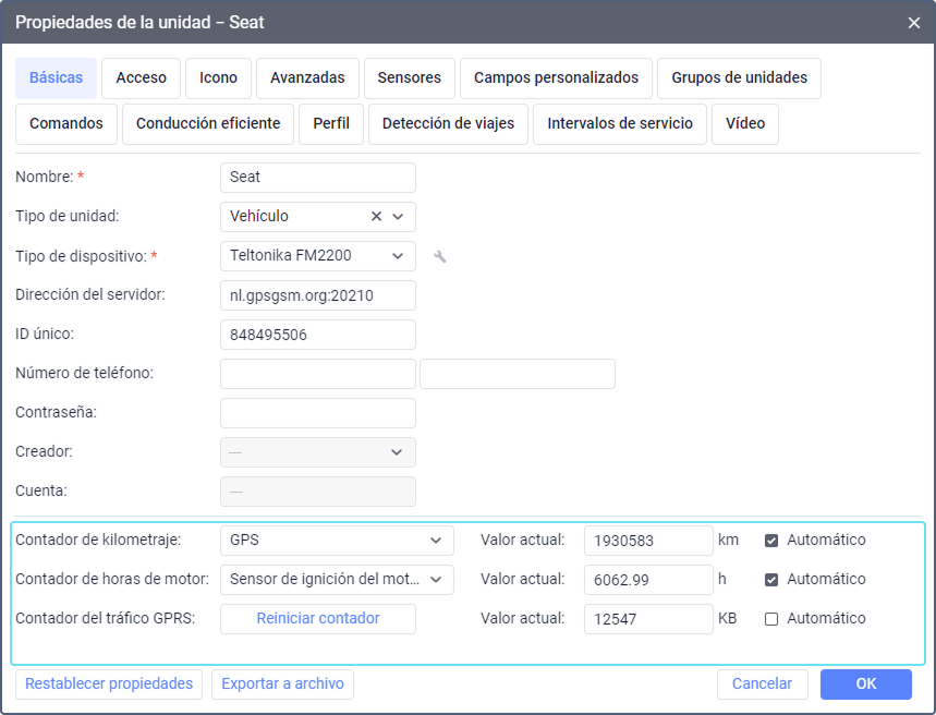 En la pestaña Básicas, aparte de las demás propiedades, puede configurar contadores de kilometraje, de horas de motor y de tráfico de datos GPRS.