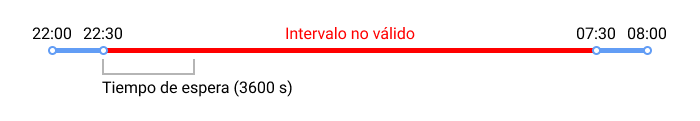 Ejemplo. Los mensajes con datos del sensor digital personalizado se han recibido a las 22:00, 22:30, 07:30 y 08:00. Si la opción Tiempo de espera está desactivada, en el informe se muestra un intervalo continuo de 22:00 a 08:00. Si está indicado el tiempo de espera de 1 hora (3600 s), se forman varios intervalos. Ya que entre el primer y el segundo mensajes ha pasado menos de una hora (de 22:00 a 22:30), estos dos mensajes forman un intervalo (válido). Entre el segundo y el tercer mensajes han pasado más de una hora, por lo tanto este intervalo (de 22:30 a 07:30) se considera no válido y no se toma en cuenta. Entre el tercero y el cuarto mensajes ha pasado menos de una hora (de 07:30 a 08:00), estos mensajes forman el segundo intervalo válido.