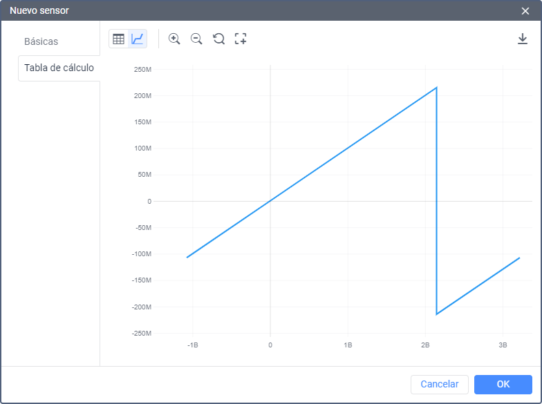 Ver el gráfico en la pestaña Tabla de cálculo en las propiedades del sensor.