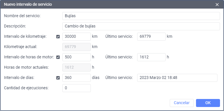 | Intervalo de horas de motor | Active esta opción e indique cada cuántas horas de motor debe realizarse el servicio. En el campo Último servicio, indique a cuántas horas de motor se realizó el último servicio. |