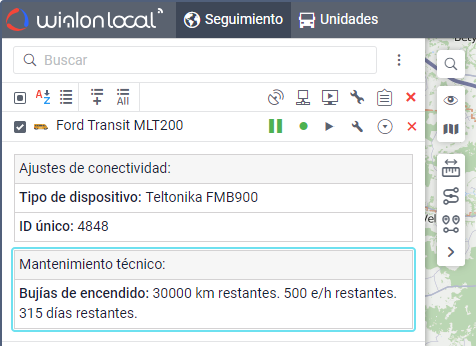 Los intervalos de servicio creados pueden mostrarse en la descripción emergente de la unidad y en la información ampliada de la unidad en la pestaña Seguimiento.