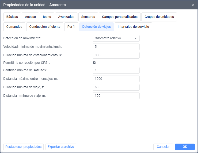 | Velocidad mínima de movimiento | Valor mínimo de velocidad con el cual se debe considerar que la unidad está en movimiento. Se indica para que las emisiones de coordenadas GPS y errores de dispositivos durante la parada de la unidad no se consideren como movimiento. Si para este parámetro está indicado 0, las paradas de la unidad no se detectan. En este caso, el sistema solo detecta viajes y estacionamientos. |