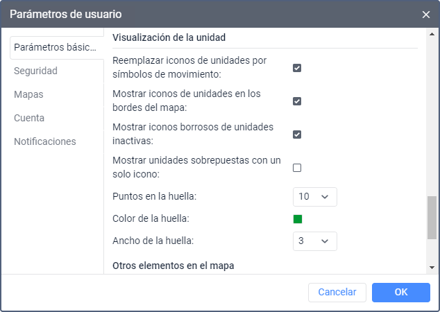 | Huella de la unidad | Para que detrás del icono de la unidad en movimiento se muestre una línea que sigue su trayecto, configure las siguientes opciones: