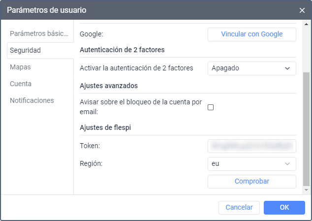 El campo con el token generado se muestra después de la autorización en flespi. El término de vigencia del token es de un año. Para ver el estado (activo/caducado) y el término de vigencia del token, apriete el botón Comprobar. Si es necesario, se puede introducir el token manualmente.