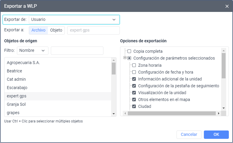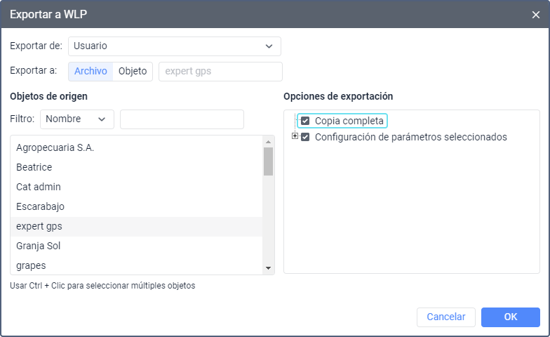 Para exportar parámetros, seleccione el punto Exportar a WLP en el menú de usuario y, en la ventana que se ha abierto, indique Usuario en el campo Exportar de. Vea la guía detallada aquí.