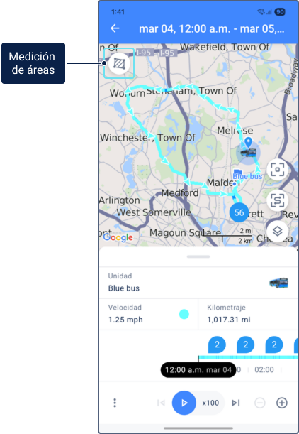 Puede navegar manualmente a puntos específicos del recorrido para ver la ubicación exacta de la unidad, su velocidad y otros valores en un momento específico.
