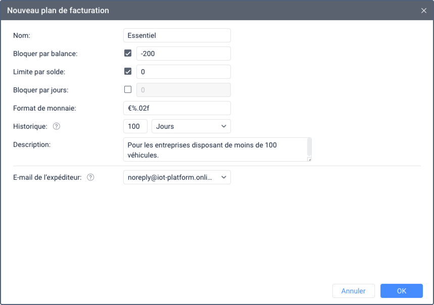 Un plan de facturation est attribué à tous les comptes du système Wialon. Il est employé pour limiter les actions des utilisateurs et pour facturer les services.