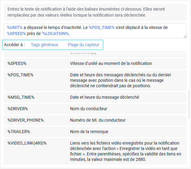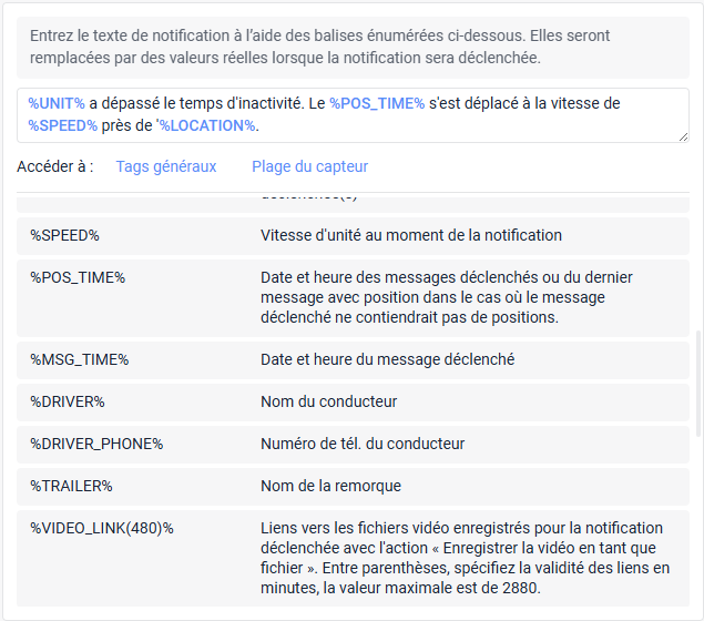 | Autres | %SPEED%, %ENGINE_HOURS%, %MILEAGE%, %LOSE_RESTORE% |