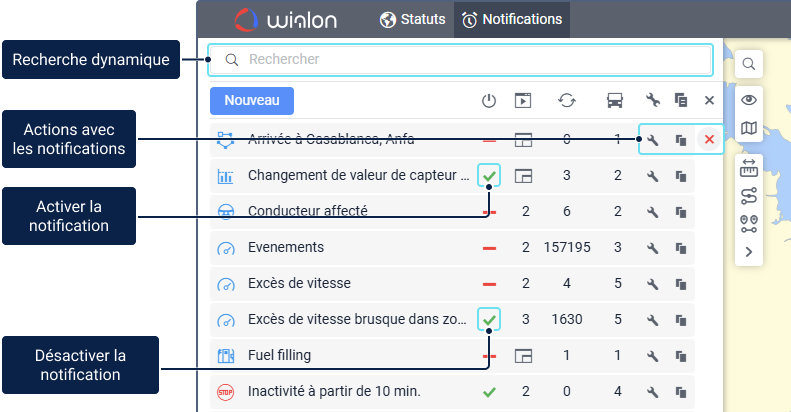 Dans l’onglet Notifications, vous pouvez voir une liste de toutes les notifications disponibles. Au-dessus de la liste, il y a le bouton Nouveau pour créer des notifications et une barre de Recherche pour trouver dynamiquement les notifications selon différents critères. Pour plus de détails, voir la page Recherche de notifications.