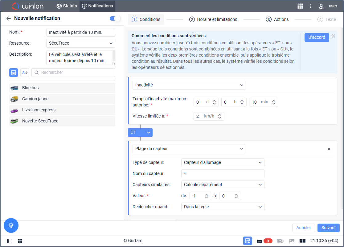 Liste de gestion des notifications et carte. Dans ce mode, vous pouvez activer ou désactiver les notifications, les rechercher et les filtrer, etc. Voir Gestion des notifications dans l’onglet.